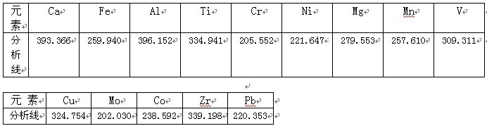根据ICP软件谱线库提供所有元素不同谱线,首先选择被测元素灵敏度高的谱线,其次考虑不受样品基体及被测元素相互之间干扰小的谱线的原则,选择分析线如下。