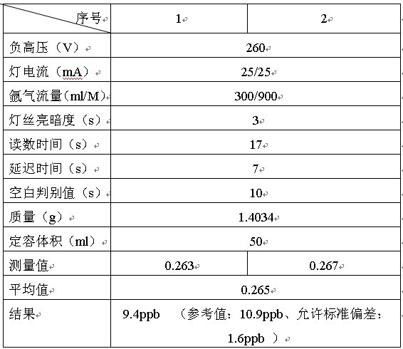 前处理:从样品中称量1.4034g于玻璃烧杯中,加入8ml HNO3和2mlHClO4加热溶解(消解温度350℃左右)。冷却后定容于50ml容量瓶中,加入1ml HNO3,5%的重铬酸钾1ml。(同时做样品空白)(还原剂加0.5%铁氰化钾)
