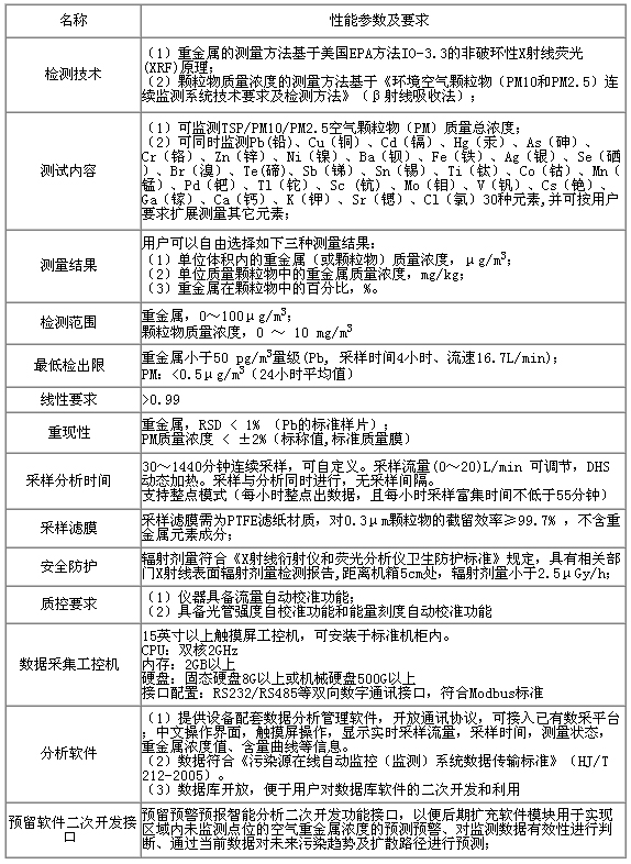 以下列出了大气重金属在线分析仪的一些重要技术参数(表1)。