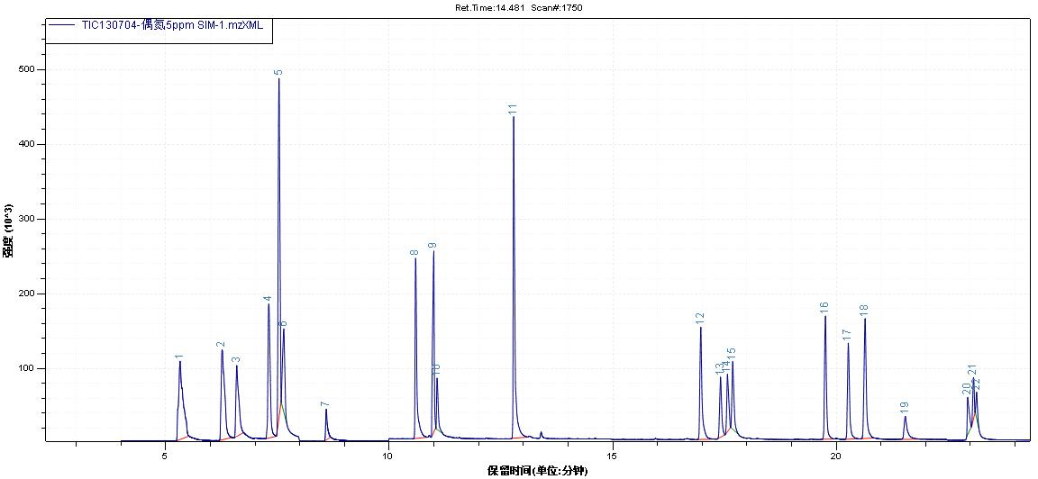 样品在柠檬酸盐缓冲溶液介质中,用连二亚硫酸钠还原分解以产生可能存在的致癌芳香胺,用专用顾鑫萃取小柱提取溶液中的芳香胺,浓缩,定容,用GC-MS气质联用仪进行测定。以目标物的保留时间和标准质谱图定性,外标法定量。