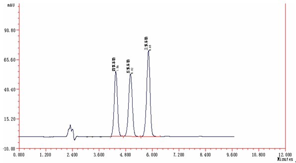 2、标准溶液的配置:用甲醇分别将3种标准品配置成适量浓度的 2,4,6--三氯苯酚,2,3,5,6--四氯苯酚、五氯苯酚的储备液,使用时各吸取适量储备液于同一容量瓶中,用甲醇稀释至刻度,摇匀,待用。