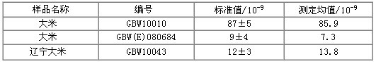 选用三种国家标准大米样品进行样品消解及样品测试,测试结果如表1所示: