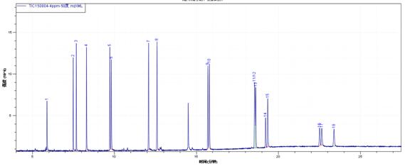 1. α-六六六;2. β-六六六;3. γ-六六六;4. 蒽-D10(内标);5. δ-六六六;6. 七氯;7. 艾氏剂;8. 环氧七氯B;9. γ-氯丹;10. 硫丹I;11. α-氯丹;12. 4,4'-DDE;13. 狄氏剂; 14. 异狄氏剂;15. 硫丹 II;16. 4,4'- DDD; 17. 异狄氏醛;18. 硫丹硫酸酯;19. 4,4'-DDT;20. 异狄氏酮; 21. 甲氧DDT;22. 苝-D12(替代物);
