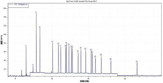 1. 四氯间二甲苯(替代物);2. 蒽-d10(内标物);3. PCB 28;4. PCB 52;5. PCB 101;6. PCB81;7. PCB 77;8. PCB 123;9. PCB 118;10. PCB 114;11. PCB153;12. PCB105;13. PCB 138;14. PCB126;15. PCB167;16. PCB156;17. PCB157;18. PCB180;19. PCB169;20. PCB189;21. PCB 209(内标)