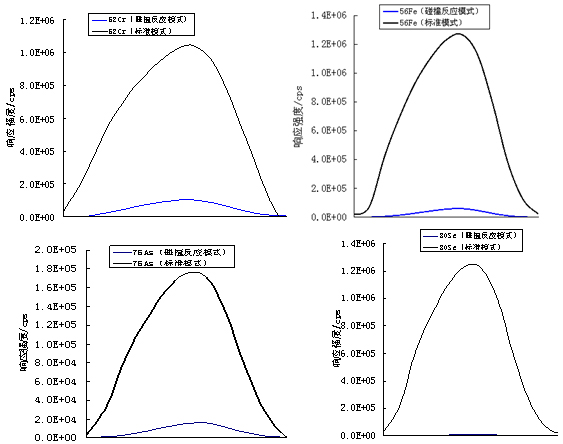 图3.52Cr、56Fe、75As、80Se在标准模式及碰撞反应模式下响应信号(52Cr、56Fe)