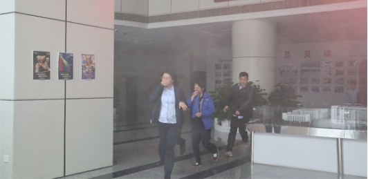 员工们捂住口鼻,有序地从紧急出口向外撤离