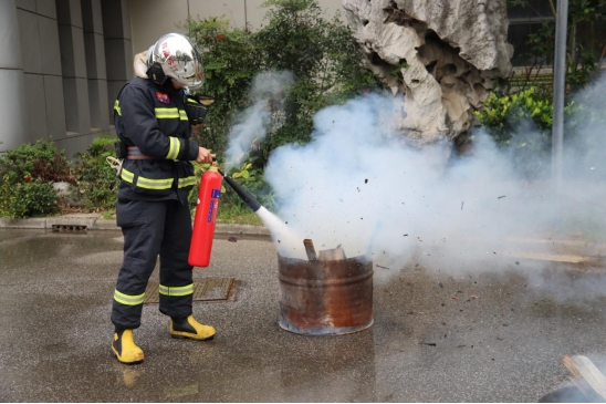 员工们手持灭火器参加现场灭火体验