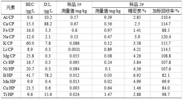 参考《GB/T 32650-2016 电感耦合等离子体质谱法检测石英砂中痕量元素》进行样品前处理。利用冷焰模式及标准模式对样品进行测试,考察背景等效浓度(BEC)、方法检出限(D.L.)、加标回收率、精密度。背景等效浓度在0.6ng/L~60.0ng/L之间,方法检出限在0.3ng/L~88.2ng/L之间,加标回收率在82.1%~120.4%之间,精密度在1.41%~6.92%之间。