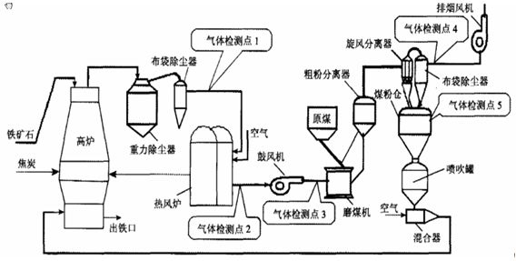 (1)监测点1:高炉煤气分析,CO和CO2,控制高炉炉况和回收能源气;