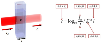 光度比色法主要是根据朗伯比尔定律,一束单色光照射于一吸收介质表面,在通过一定厚度的介质后,由于介质吸收了一部分光能,透射光的强度就要减弱。吸收介质的浓度愈大,介质的厚度愈大,则光强度的减弱愈显著。