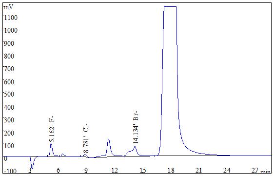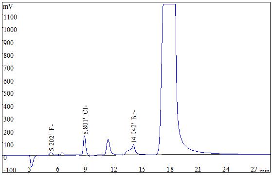 准确称取0.2g(精确至0.0001g)试样,采用氧弹燃烧后冷却定容,经0.22μm的水系滤膜过滤后上机得到测试谱图如下图2、图3所示。
