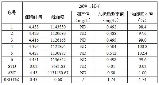 随机抽取2#涂层试样进行加标0.5mg/L重复测定6次,考察了保留时间、峰面积的重复性及加标回收率,其中保留时间的重复性(RSD)为0.43%,峰面积的重复性(RSD)为0.68%,加标回收率的重复性(RSD)为1.74%,测试结果详见表3所示。