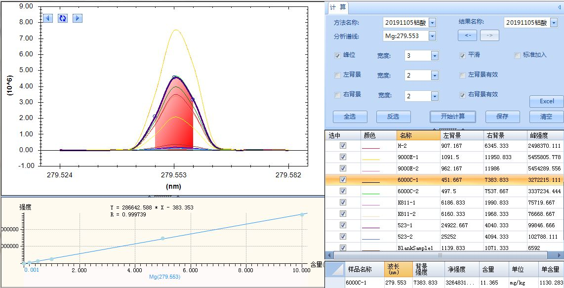 入射功率1150W,频率27.12MHz ,观测方式为轴向观测,等离子气流量:14L/min,辅助气流量:0.8L/min,雾化气流量:0.7L/min,蠕动泵转速:2.0mL/min,积分时间15s,重复3次,取平均值。