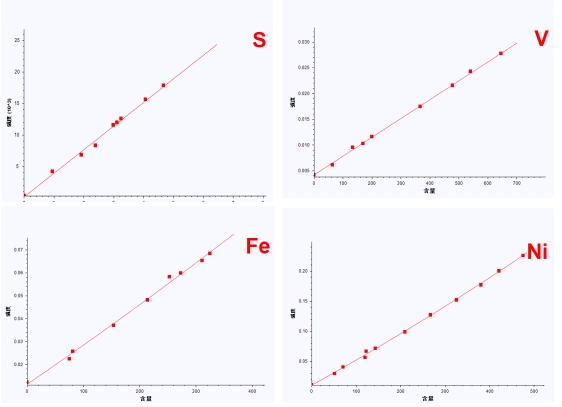 上图为使用EDX 6000C能量色散荧光光谱仪测量不同含量石油焦二次标样,建立S、V、Fe、Ni元素含量与强度的一次或二次校正工作曲线。由图可知,S、V、Fe、Ni组分含量与强度具有非常好的线性关系。