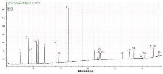 2.2 23种偶氮染料标准溶液TIC(总离子流检测图):