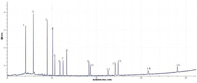 3.2 15种邻苯二甲酸酯类物质混合标准溶液总离子流监测图(TIC):