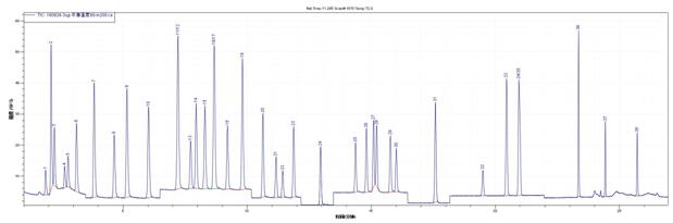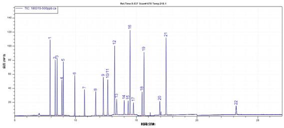 1. α-六六六;2. β-六六六;3. γ-六六六;4. 蒽-D10(内标);5. δ-六六六;6. 七氯;7. 艾氏剂;8. 环氧七氯B;9. γ-氯丹;10. 硫丹I;11. α-氯丹;12. 4,4'-DDE;13. 狄氏剂; 14. 异狄氏剂;15. 硫丹 II;16. 4,4'- DDD; 17. 异狄氏醛;18. 硫丹硫酸酯;19. 4,4'-DDT;20. 异狄氏酮; 21. 甲氧DDT;22. 苝-D12(替代物);