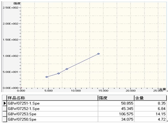 以下使用EDX 3600B型对萤石国标样GBW07252实际测试的所得的谱图,工作曲线等相关数据: