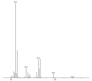 甜蜜素的主要衍生物环己醇亚硝酸酯作为定性和定量,如图1。保留时间8.511min.定性离子(m/z)为55,81,83。定量离子为55。质谱图见图2.